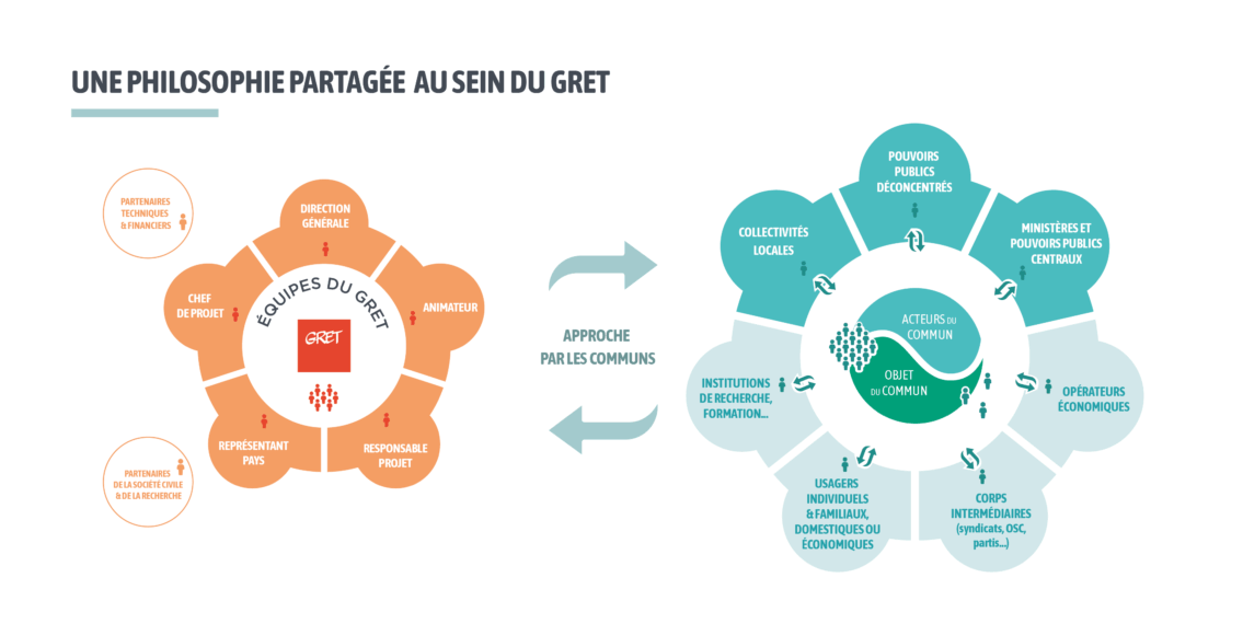 L’adoption d’une approche par les communs dans le cadre des projets requiert que les membres de l’équipe Gret partagent l’intention politique, et acquièrent des références et de l’expérience. Elle suppose une cohérence de discours entre les équipes internes (entre Direction, Représentations, chefs de projet, animateurs… mais aussi chargés de gestion et de comptabilité que l’approche par les communs poussera aussi au pas de côté dans l’utilisation des outils) et vis-à-vis des interlocuteurs institutionnels en France et au sein des pays d’intervention.