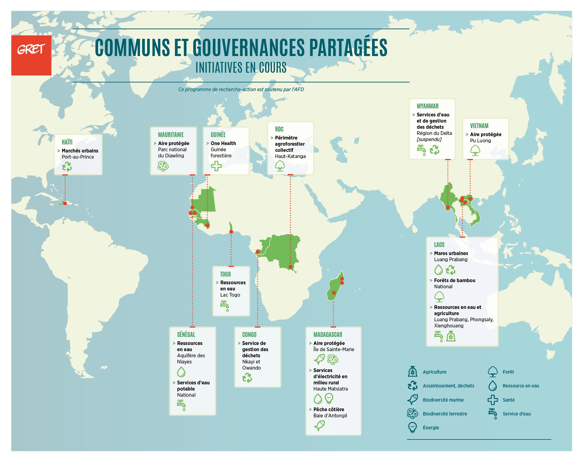 L’approche par les communs est ou a été expérimentée par le Gret dans une quinzaine de situations d’action afin d’y favoriser des dynamiques de commun. Chaque situation d’action s’accompagnant d’un contexte, d’une histoire, d’enjeux spécifiques, l’approche par les communs y devient propre, singulière. C’est d’ailleurs aussi pour cela qu’elle s’acquiert dans la pratique et qu’il est si difficile d’en retirer une méthodologie.